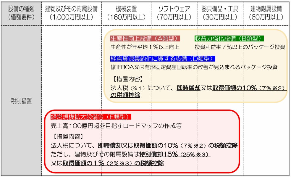 令和7年度の税制改正により、売上高100億円を目指す中小企業の設備投資を後押しする経営規模拡大設備等【E類型】が追加され、1,000万円以上の建物及び付属設備も対象となりました。